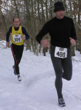 Nico Lang (337), Benjamin Schächinger (342), Mathias Kraus (336) und Matthias Kugel (?) von der LG Nagoldtal auf der Verfolgung der enteilten Seniorenläufer beim Sprintrennen über 1 100 Meter. - Gunther und Jürgen vor den Start des Hauptlaufes.
