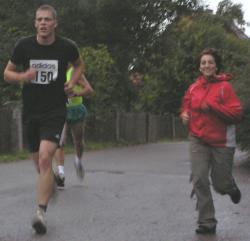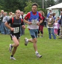Günter, in der ersten Runde solo, - in der 2. Runde nur am "orangenen" Schuh zu erkennen. Christoph Kienle (65.) setzt sich noch 15 Sekunden ab. Uwe Bodmer (Nr. 147) schon "tausendmal" in Ergebnislisten gelesen, bekommt ein "Gesicht". Er gewinnt die M 55 - herzlichen Glückwunsch - und hat von hier bis zum Ziel irgendwo 3 lange Sekunden auf mich herausgearbeitet.
