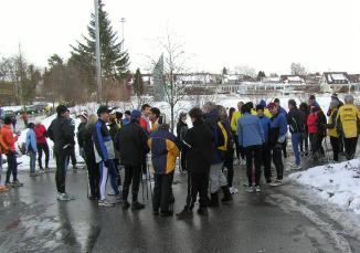 Seit 10 Stunden taut es auch in Neubulach, trotzdem versammelt sich eine große Schar von Läufern und Walkern an der großen Sporthalle. - Auch Ostelsheimer sind dabei.
