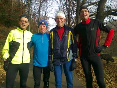 Vor dem "beinharten Berglauftraining" zum Schönbergturm (Pfullinger Onderhos) am 16. November 2011 in Pfullingen v. l. : Günter, Gastgeber und "Pfullinger Berglaufwart" Wolfgang, Uwe und Eddy.