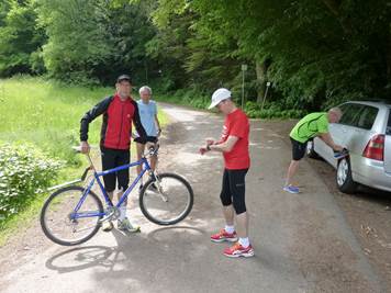 Uwe (15 km mit Rad), Wolfgang, Eddy, Günter 8,4 km Lauf/Rest Rad und Gastgeber Herbert. - Die "3 Vollprofis" auf den letzten Metern.