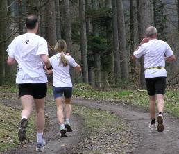 Siegerin Mirjam Faßnacht geht das Rennen locker an, Karl Schwandt (rechts) begleitet sie die nächsten Kilometer. - Annette in rot gut getarnt hinter " fitten Templern" und vor Michael Beck.
